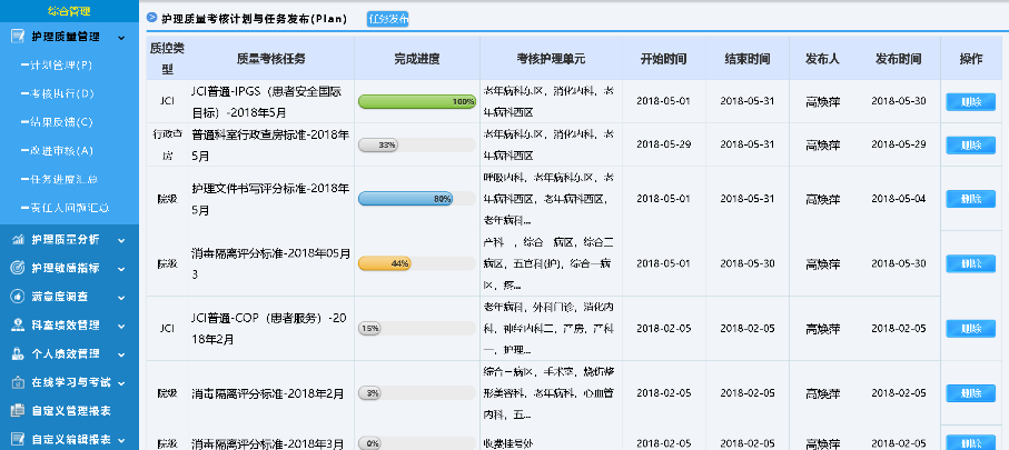 針對護(hù)理質(zhì)量管理重點,支持自定義質(zhì)控表單,使用評分、扣分等多種考核方式,電子化護(hù)理質(zhì)量考核、持續(xù)跟蹤記錄,并可以用于統(tǒng)計分析。
