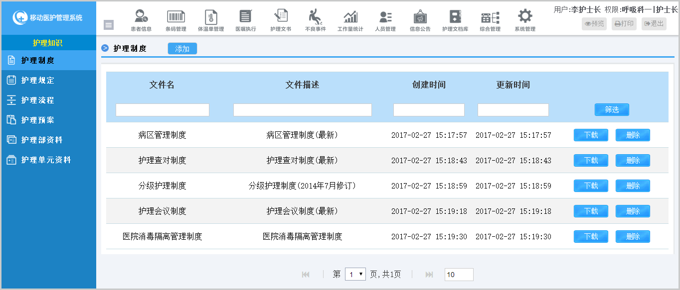 針對醫(yī)院等級評審和日常護(hù)理管理需要,系統(tǒng)內(nèi)置6大分類,可以自由上傳、完善文檔,并且可以實現(xiàn)分科室協(xié)同編輯、查看,簡化護(hù)理文檔管理工作量。