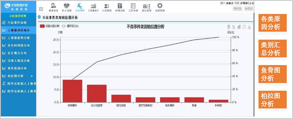 支持14項目+時間+科室+個人+患者 超精細(xì)化統(tǒng)計分析,自動抽取 跌倒評估、墜床評估等護(hù)理文書數(shù)據(jù),進(jìn)行二次機(jī)構(gòu)化統(tǒng)計分析,極大降低工作量。