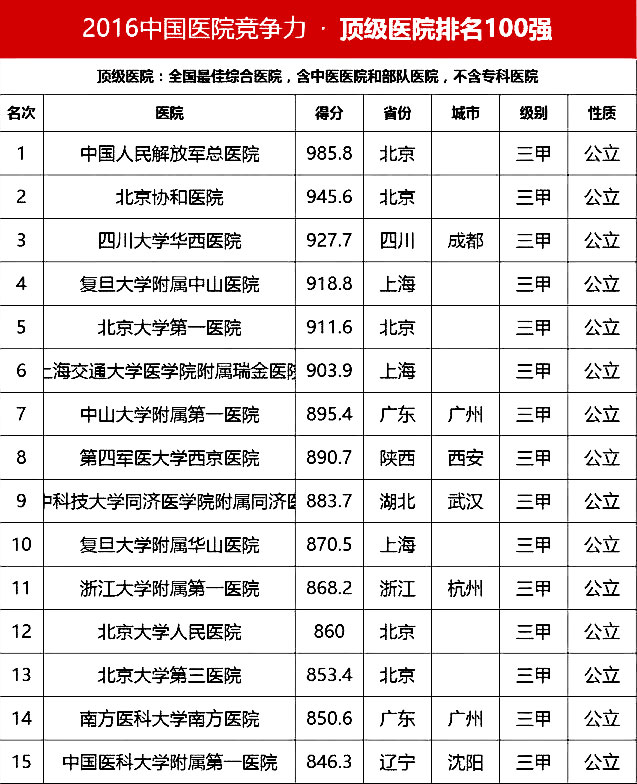 “頂級醫(yī)院100強(qiáng)”采用的排名指標(biāo)體系包括四個(gè)方面:醫(yī)院最優(yōu)規(guī)模(實(shí)開床位數(shù)、年門急診量、年出院量、全院人數(shù));醫(yī)療技術(shù)(正高職稱人數(shù)/全院人數(shù)、全院醫(yī)師人數(shù)/實(shí)開床位數(shù)、醫(yī)療設(shè)備資產(chǎn)/總資產(chǎn)、年住院手術(shù)量/年出院量、國家級衛(wèi)紀(jì)委臨床重點(diǎn)專科/總??茣CU床占比);醫(yī)院運(yùn)行(平均住院天數(shù)、床位使用率、門診均次費(fèi)用/當(dāng)?shù)厝司鵊DP、住院均次費(fèi)用/當(dāng)?shù)厝司鵊DP、外省住院病人占比);學(xué)術(shù)影響力(院士人數(shù)、學(xué)術(shù)領(lǐng)袖占比、教育部重點(diǎn)學(xué)科及重點(diǎn)實(shí)驗(yàn)室/總??茢?shù)、本年度獲國家自然科學(xué)基金項(xiàng)目數(shù)量和總?cè)~)。